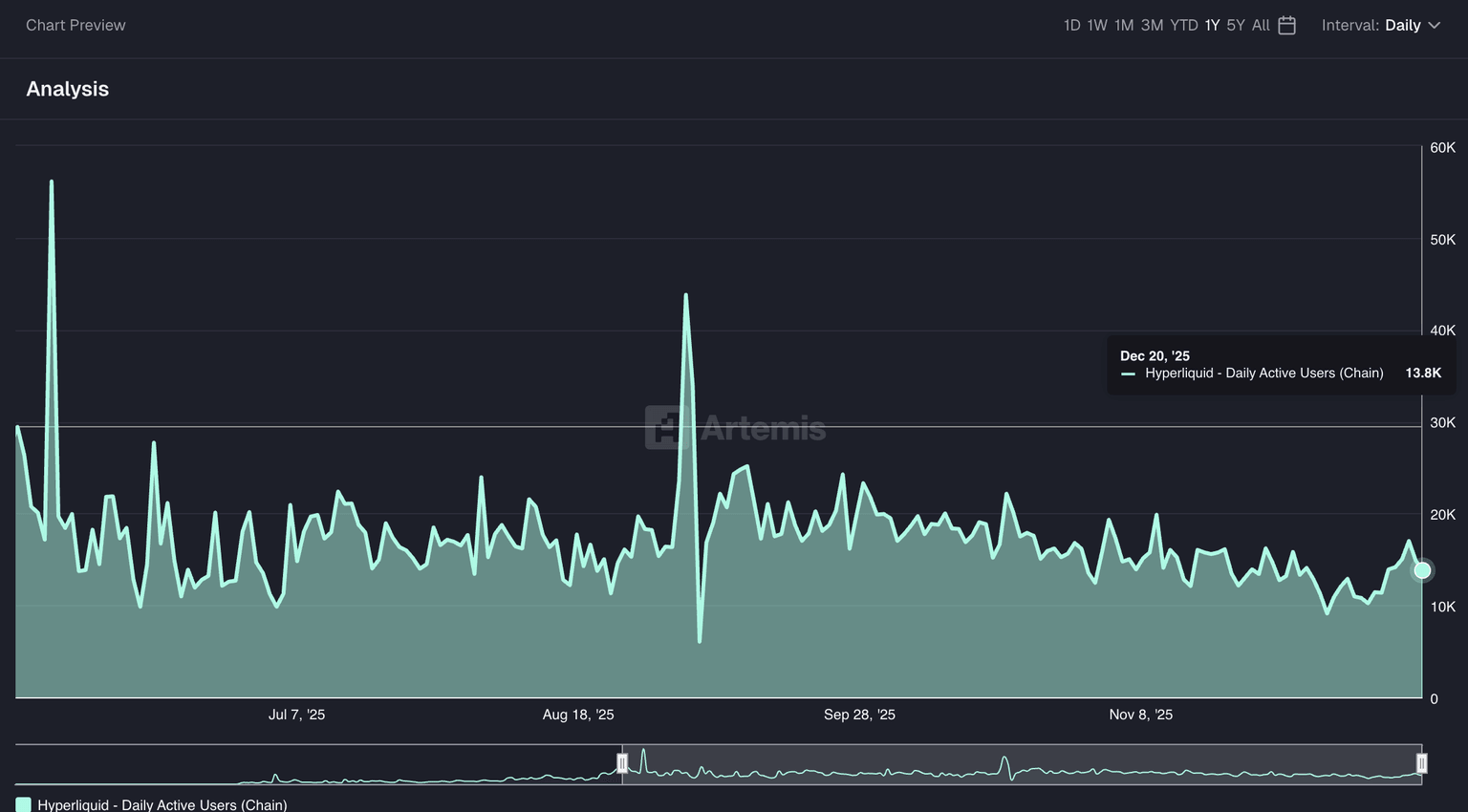 Los datos de Artemis muestran que los usuarios activos diarios se situaron en 13.800 el viernes, en comparación con 9.100 el 6 de diciembre. Esto indica una recuperación a corto plazo en una tendencia de declive más amplia. Si el mercado de criptomonedas en general se estabiliza, podría catalizar un aumento constante en los usuarios activos y aumentar la demanda en Hyperliquid.