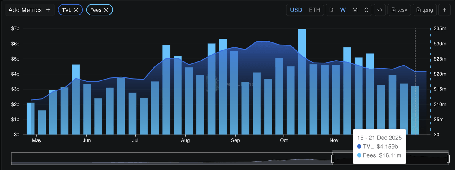 Los datos de DeFiLlama muestran que las tarifas recaudadas la semana pasada totalizaron 16,11 millones de dólares, el total semanal más bajo hasta ahora en diciembre. Esto sugiere que, a pesar de la recuperación a corto plazo en el número de usuarios, se pagan tarifas más bajas, lo que indica un bajo apetito por el riesgo.