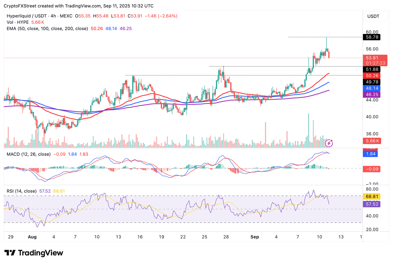 El repunte de Hyperliquid a un nuevo máximo histórico de 58.78$ está provocando toma de beneficios y creando volatilidad el jueves. La imagen técnica actual corre el riesgo de extender las caídas hacia 50.00$, respaldada por una señal de venta del indicador de Convergencia/Divergencia de la Media Móvil (MACD) en el gráfico de 4 horas.