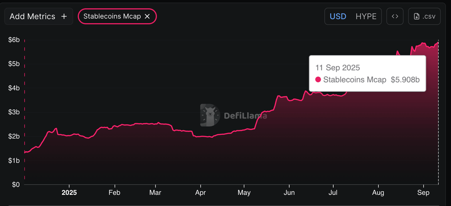 - La capitalización de mercado de las stablecoins en Hyperliquid se acerca a la marca de 6 mil millones de dólares a medida que crece la adopción de la plataforma.