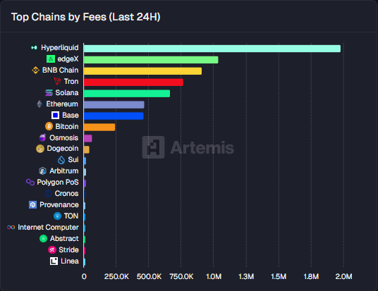 Según los datos de Artemis Terminal, la recolección de tarifas de cadena de 24 horas de Hyperliquid es de 2 millones de dólares, liderando la lista de otras redes como edgeX y BNB Chain, lo que indica un creciente interés entre los traders y liquidez en la cadena de HYPE.