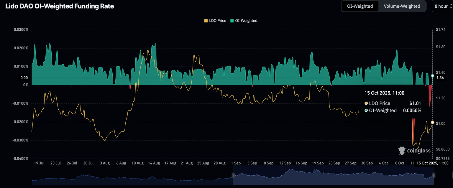 La caída repentina sorprendió a los operadores, muchos de los cuales contaron pérdidas en medio de liquidaciones masivas. Los datos de CoinGlass muestran que la financiación ponderada por el interés abierto de LDO se ha recuperado, promediando 0.0050% en el momento de escribir. A medida que el sentimiento se vuelve positivo, implica que los operadores están acumulando posiciones largas, anticipando que el precio de LDO se mantenga por encima del soporte a corto plazo de 1.00$.