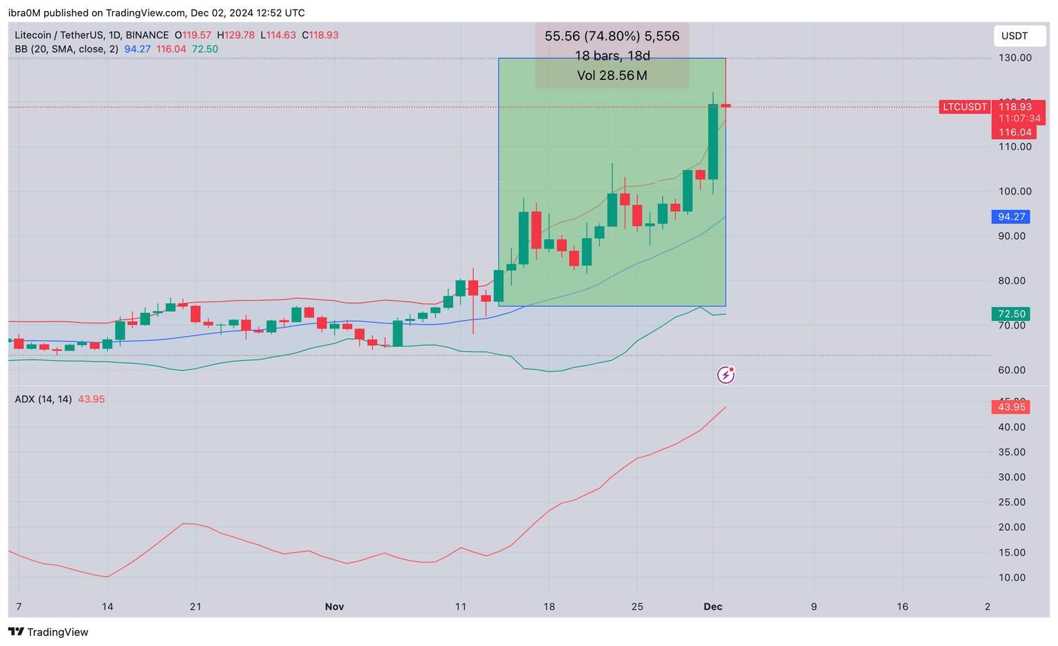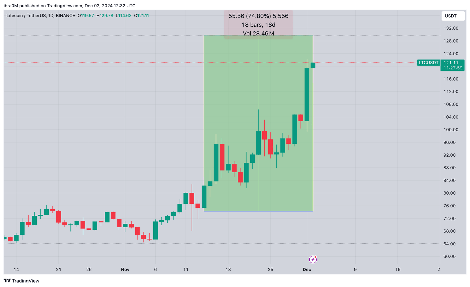 El impulso alcista de Litecoin sigue siendo fuerte, con precios ganando un 74.8% en 18 días como se muestra en el gráfico.