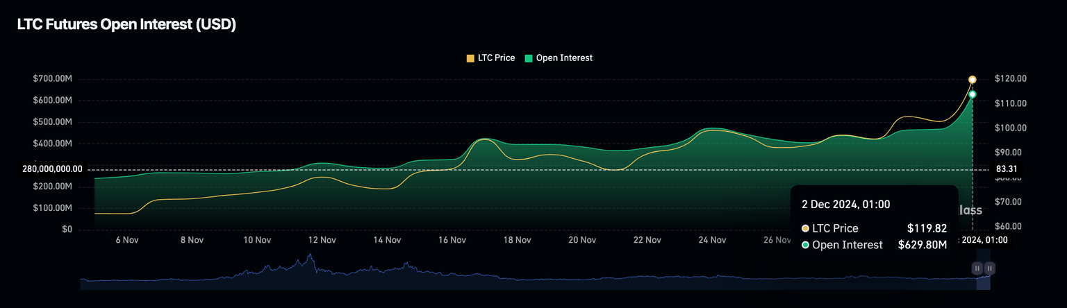 Después de 225 millones de dólares en entradas de capital en siete días, el interés abierto de Litecoin alcanzó los 629 millones de dólares el lunes.