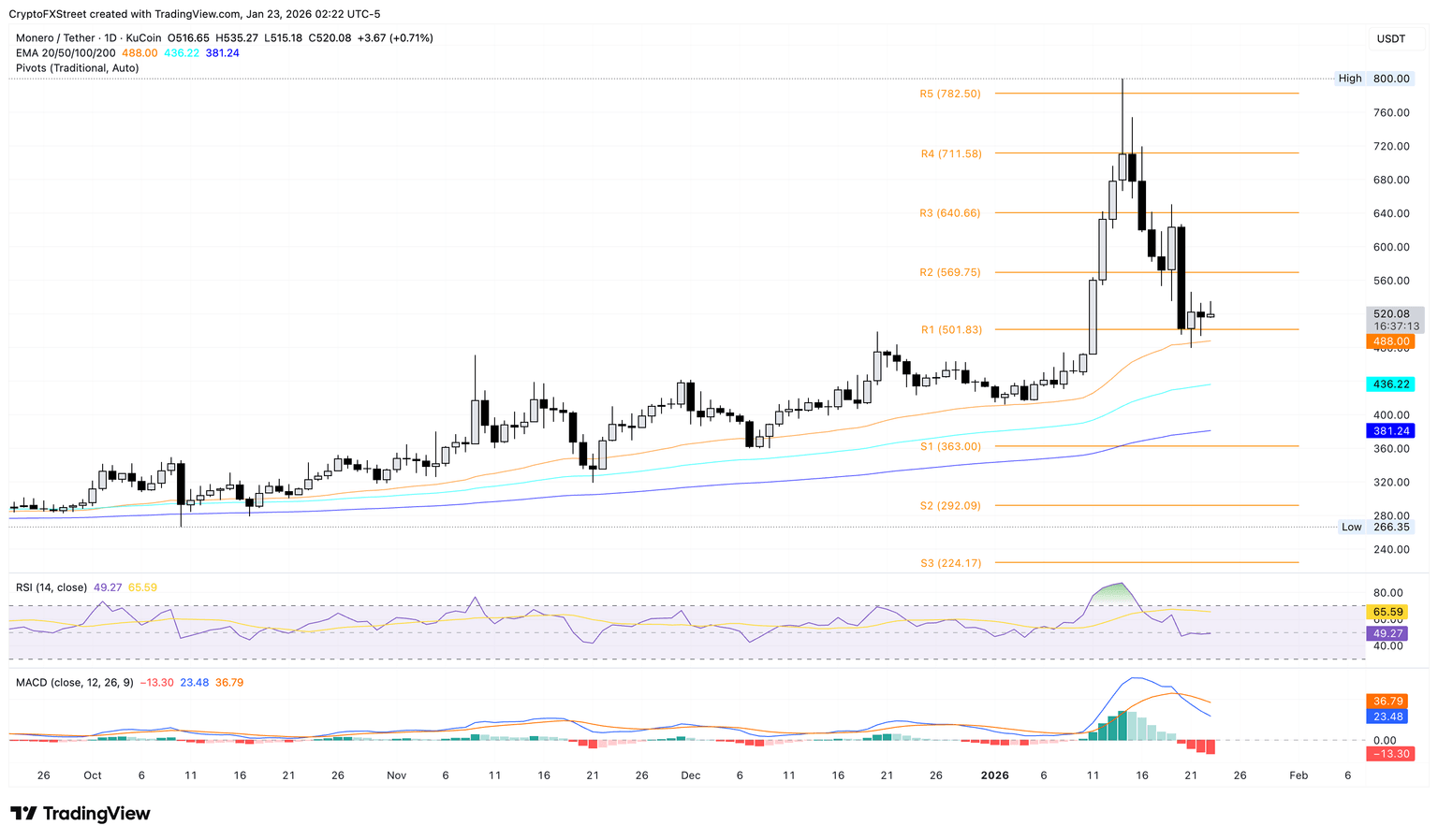 - Monero se mantiene por encima de 500$, con la EMA de 50 días limitando la baja.