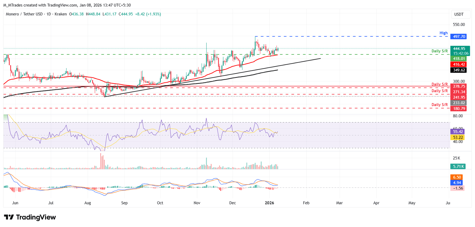 El precio de Monero encontró soporte alrededor del nivel diario de 418$ el domingo y subió casi un 6% en los siguientes dos días. Este nivel diario en 418$ se alinea aproximadamente con la media móvil exponencial (EMA) de 50 días en 416.42$, haciendo de esta área un nivel de soporte clave. Al momento de escribir el jueves, XMR se cotiza ligeramente más alto, alrededor de 444$.