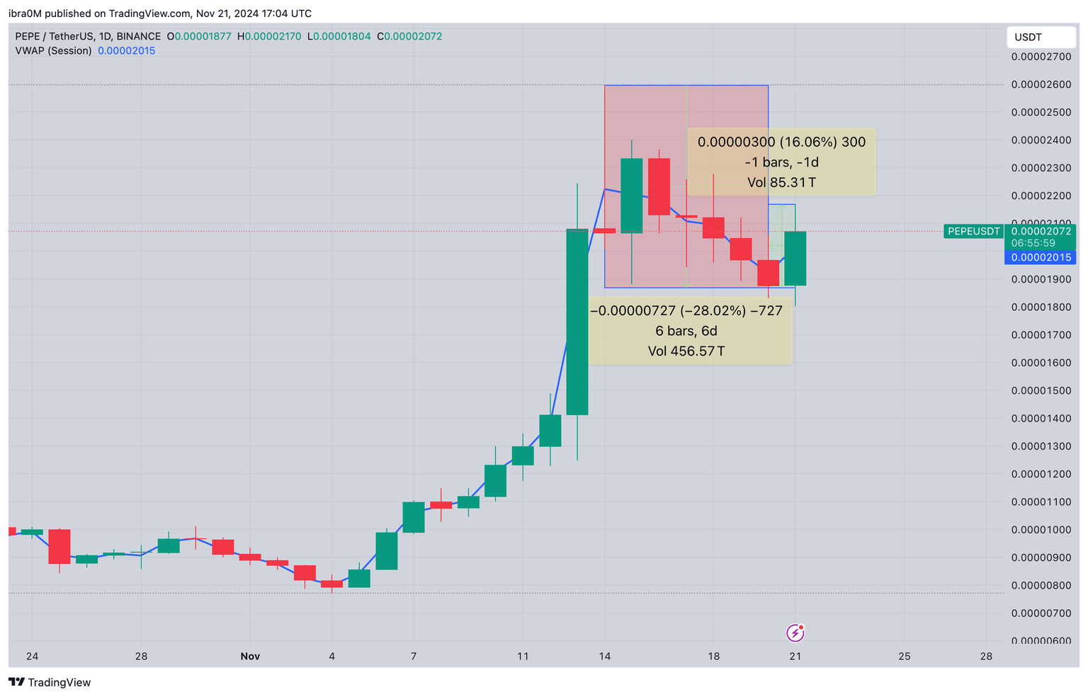 Mirando el gráfico anterior, PEPE abrió la negociación en 0.000018$ el 21 de noviembre, bajando un 27%, en cinco días consecutivos de pérdidas después de rechazar el pico global de 0.000026$ registrado el 14 de noviembre.