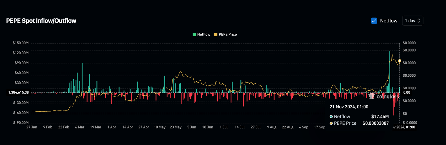 Aún más, las entradas de PEPE en las plataformas aumentaron 17.5 millones de dólares el 21 de noviembre, señalando un aumento en los volúmenes de mercado a corto plazo que apoyan el repunte.