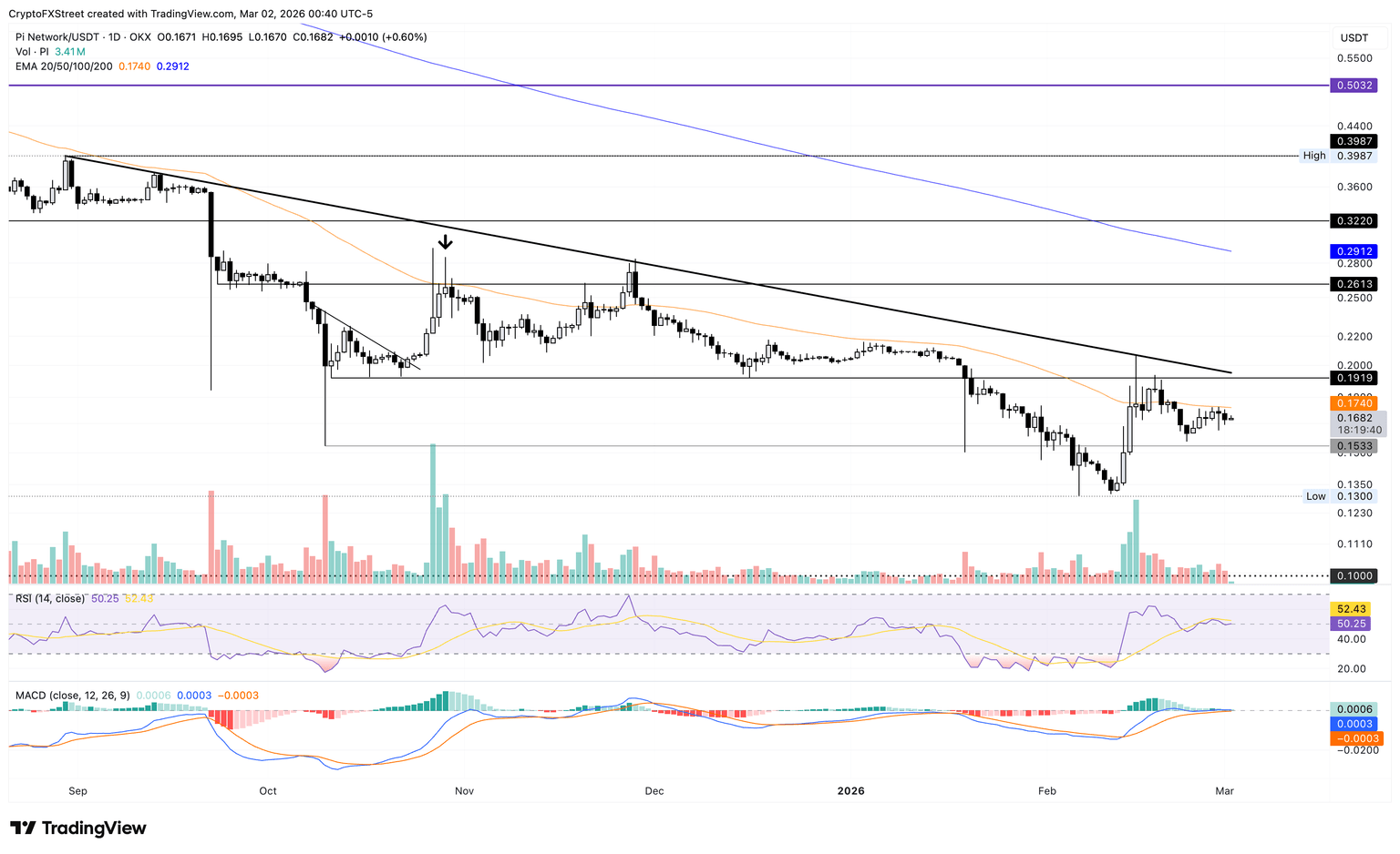 - Pi Network se mantiene por debajo de la marca de 0.1700$ el lunes tras una caída del 2% el día anterior desde la EMA de 50 días.
