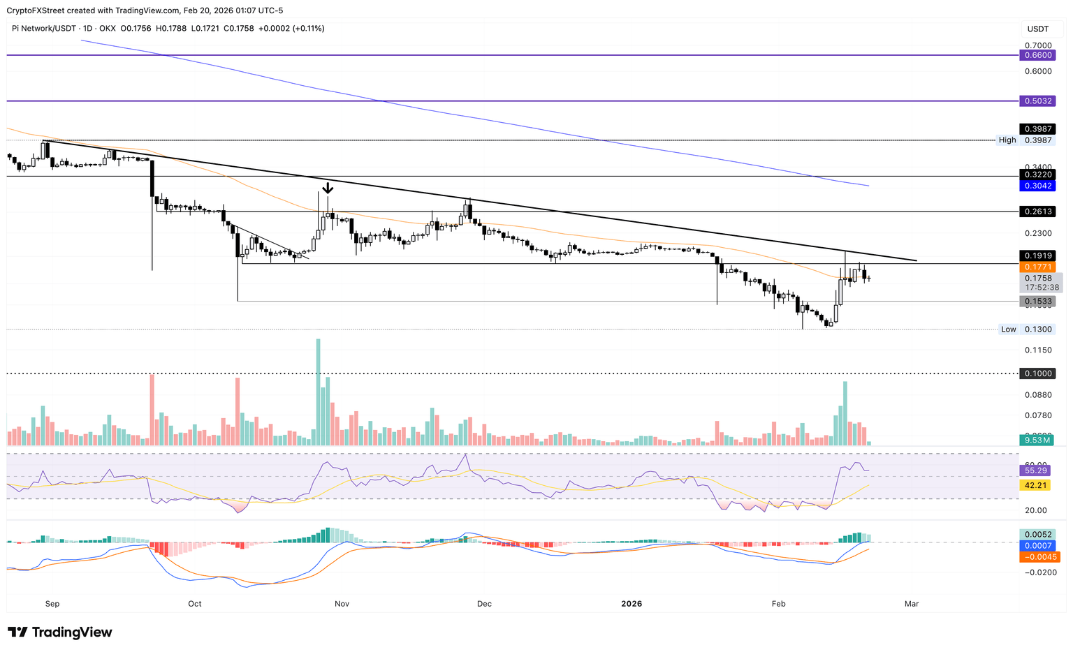 En el momento de escribir, Pi Network lucha cerca de la EMA de 50 días en 0.177$, con un riesgo a la baja hacia el nivel de soporte de 0.1533$ que se avecina.