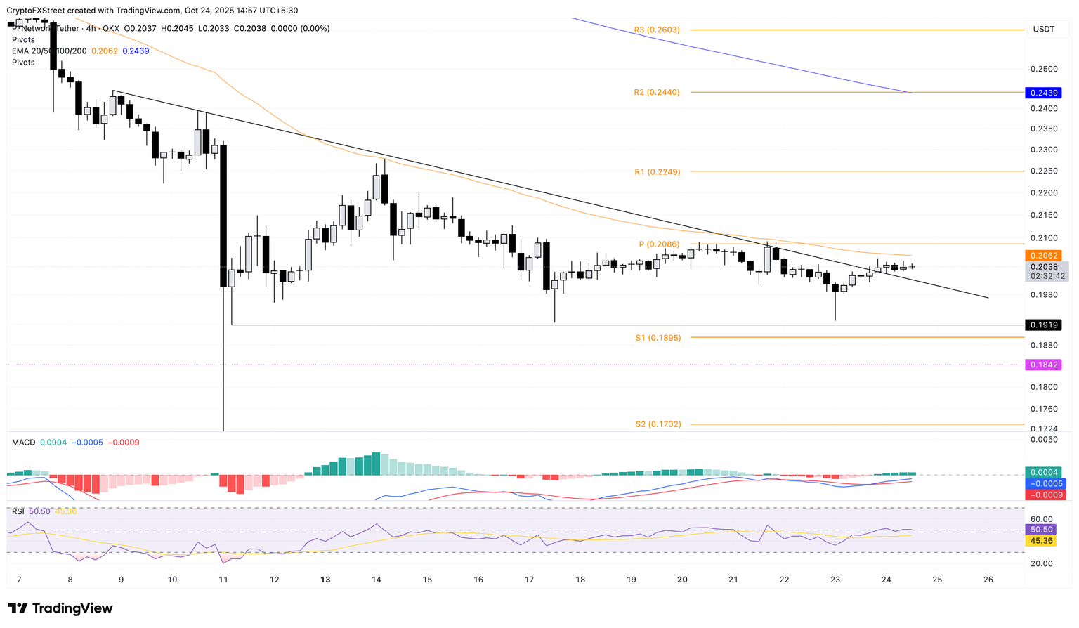Pi Network supera una línea de tendencia de resistencia local, confirmando la ruptura de un patrón de triángulo descendente en el gráfico de 4 horas. Sin embargo, la criptomoneda de minería móvil enfrenta resistencia de la EMA de 50 periodos en 0.2062$, luchando por extender su recuperación.
