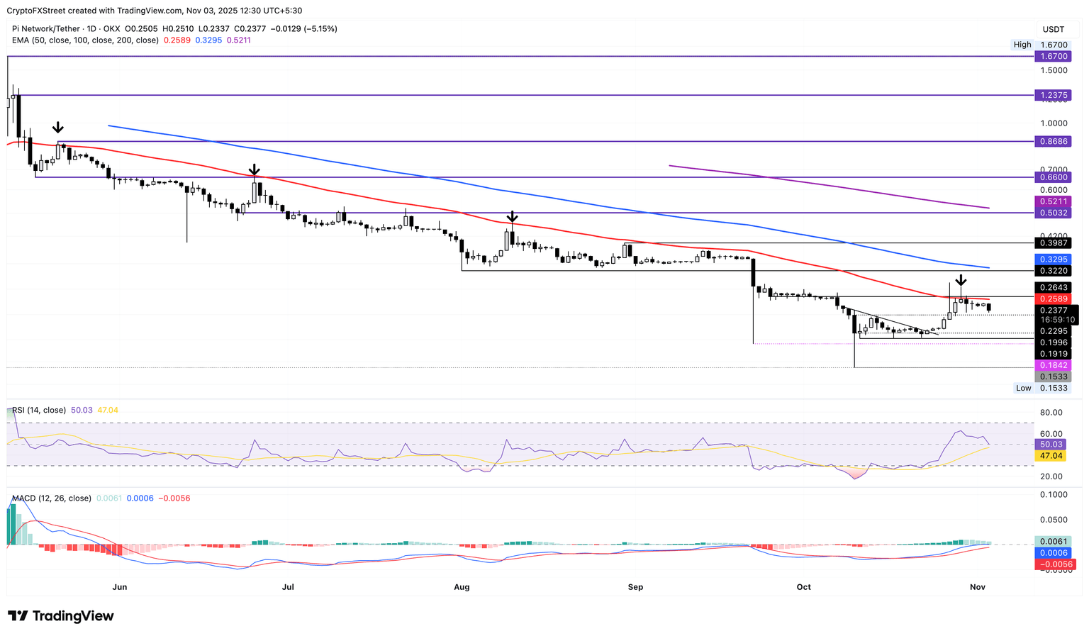 - Pi Network extiende la reversión desde la EMA de 50 días a medida que la presión de compra disminuye.
