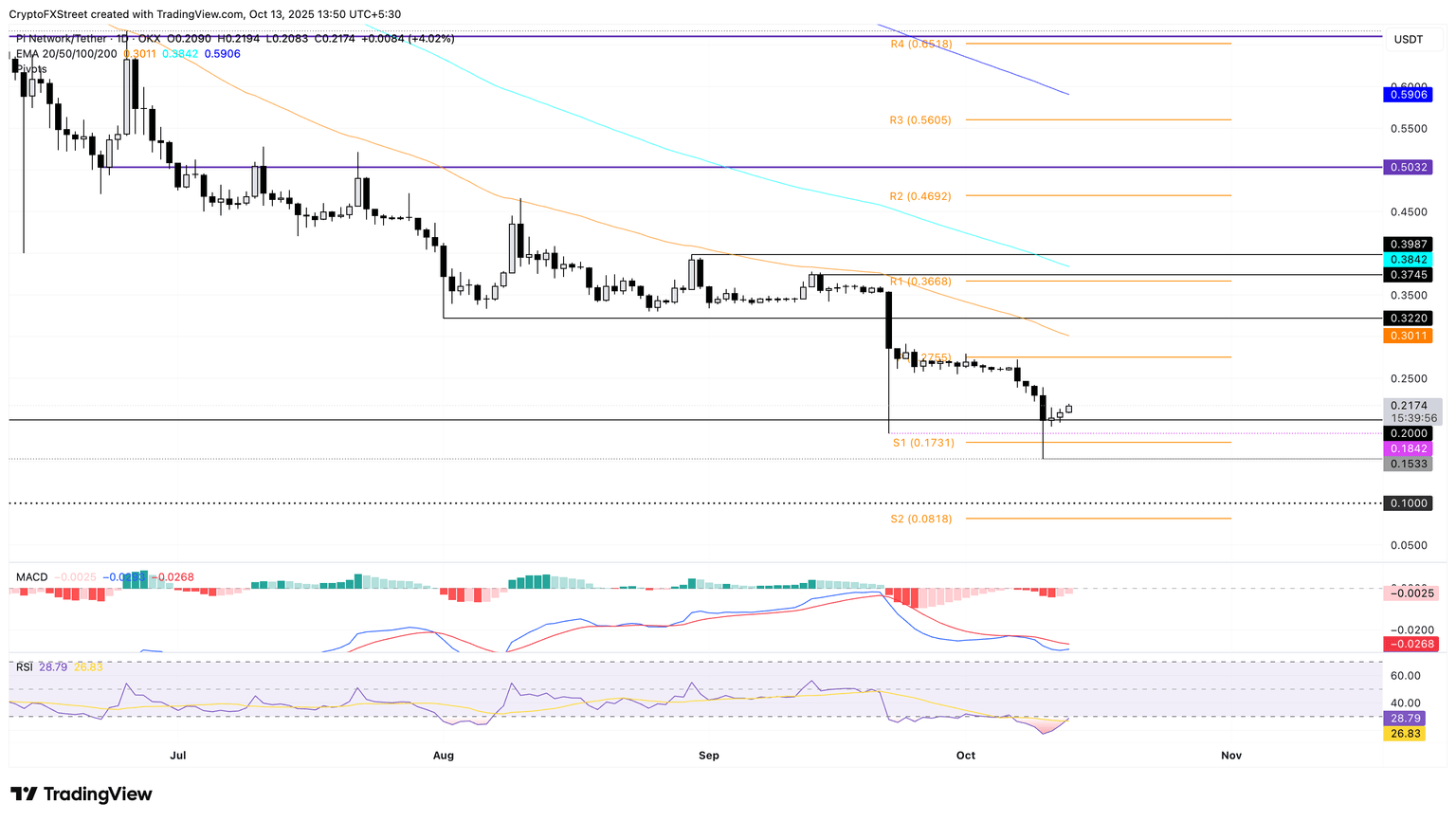 Mirando hacia abajo, los niveles de soporte cruciales para Pi Network permanecen en el nivel psicológico de 0.2000$ y el nivel del Punto de Pivote S1 en 0.1731$.