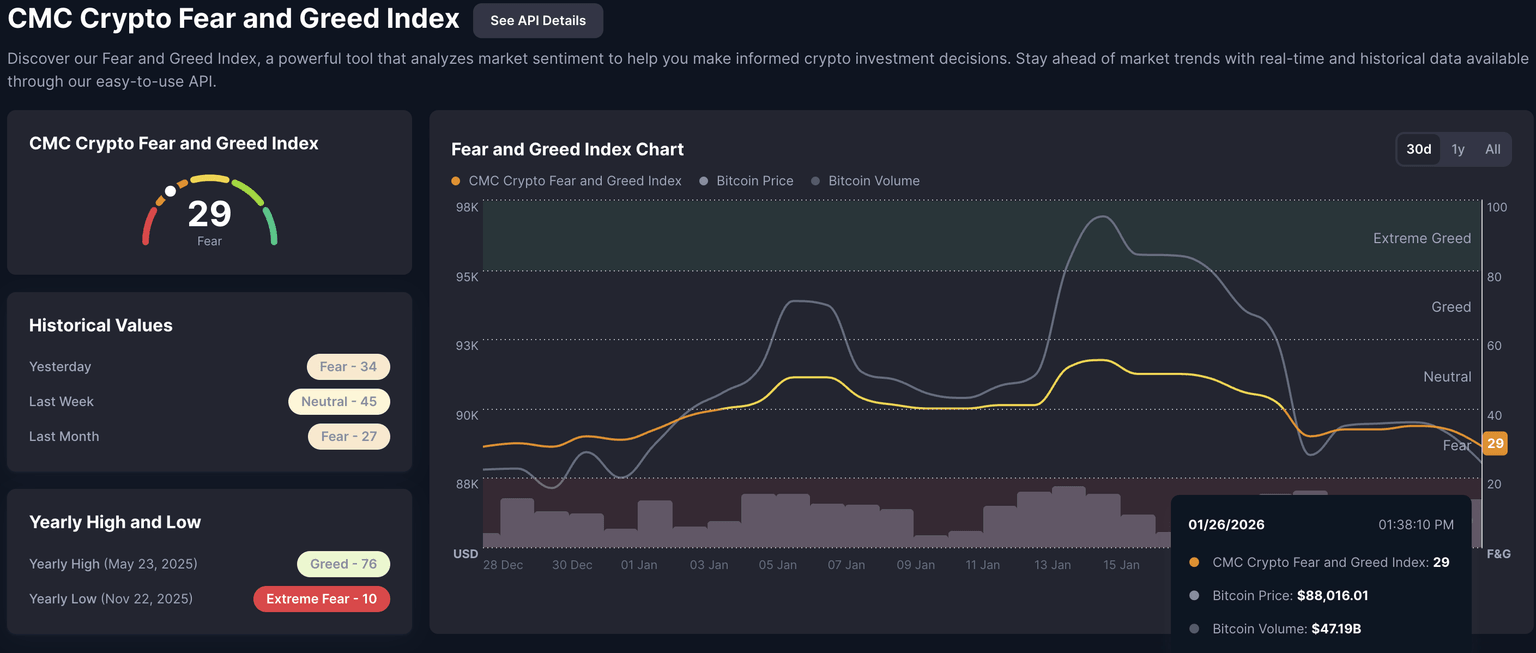 El indicador de miedo y codicia de CoinMarketCap en 29 sugiere un sentimiento adverso al riesgo entre los inversores. Una lectura entre 20 y 40 indica miedo, mientras que una caída por debajo de 20 señalaría miedo extremo, indicando una venta masiva en el mercado de criptomonedas.