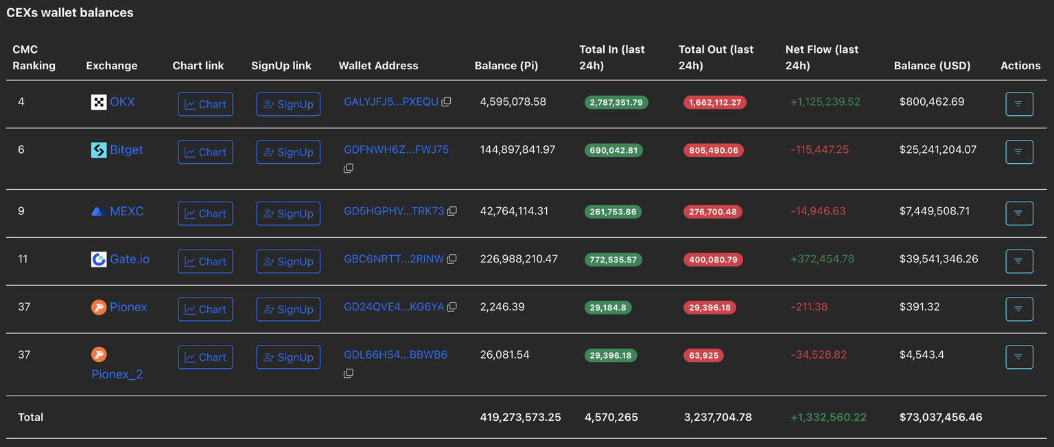 Los datos de PiScan muestran un aumento constante en los depósitos realizados en CEX, totalizando 1.33 millones de tokens PI en las últimas 24 horas. El intercambio OKX registró 1.12 millones en entradas, el mayor entre los intercambios registrados bajo Know-Your-Business (KYB) que apoyan el token Pi.