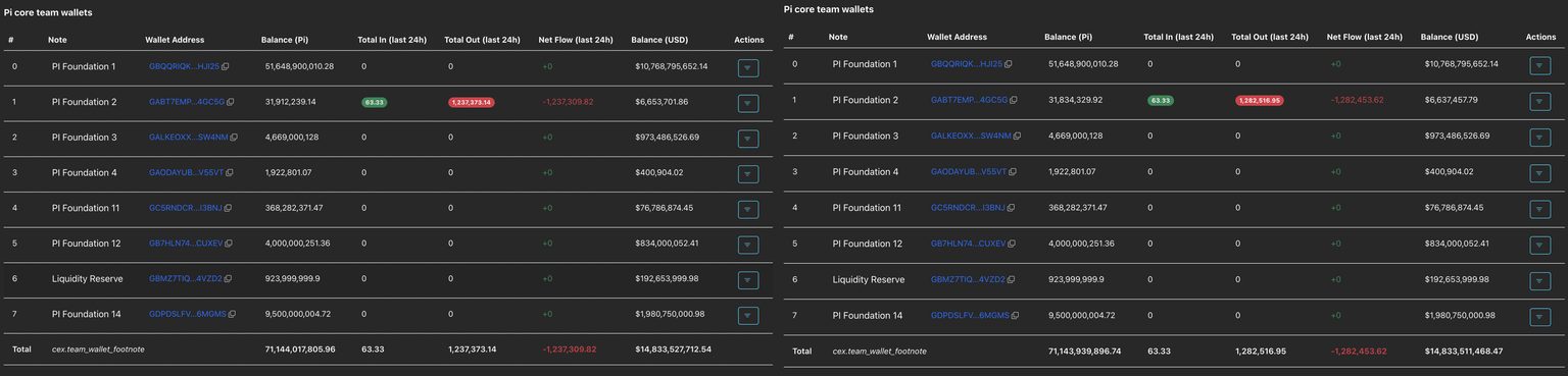 Mientras la demanda aumenta en los intercambios, la billetera de la Pi Foundation #2 registra una salida de 1.28 millones de tokens PI. Los flujos de tokens casi iguales pero opuestos mantienen a la red Pi en tensión.