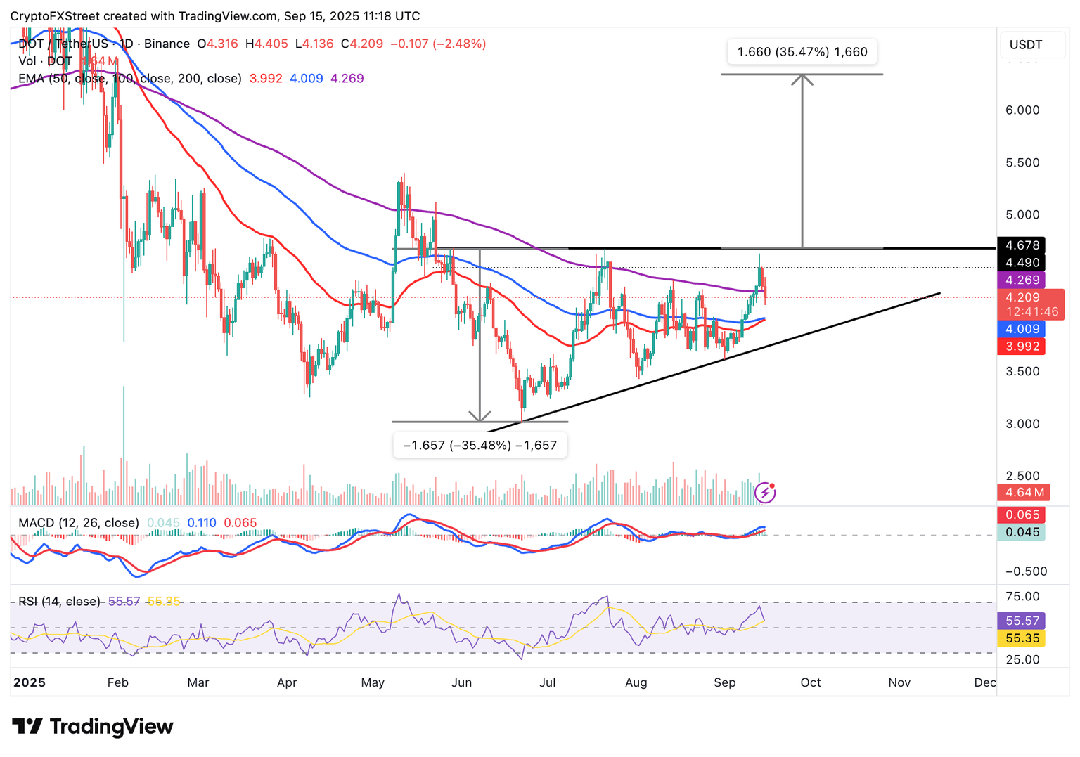 Polkadot se mantiene por debajo de la media móvil exponencial (EMA) de 200 días en 4.26$ en el momento de escribir el lunes, tras una corrección desde el máximo de la semana pasada de 4.62$.