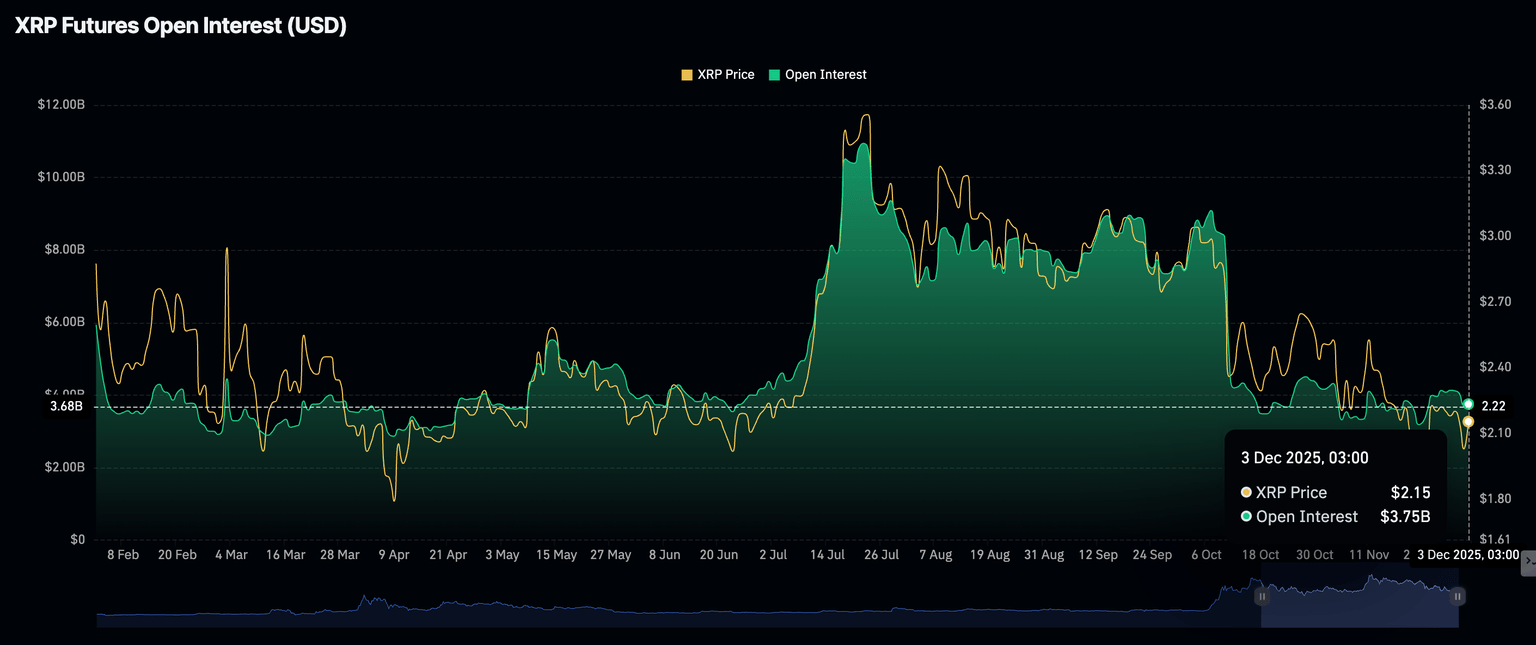 - La demanda minorista de derivados de XRP disminuye, con un interés abierto en futuros que promedia 3.75 mil millones de dólares el miércoles.