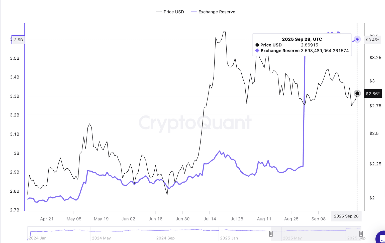 Los poseedores de XRP han transferido grandes cantidades del token a los intercambios desde principios de septiembre, aumentando así las reservas. Según datos de CryptoQuant, las reservas en Binance aumentaron un 19.4% a 3.6 mil millones de XRP desde 2.9 mil millones de XRP hasta el domingo. Este aumento coincidió con la caída del precio de XRP de 3.18$ el 13 de septiembre a alrededor de 2.70$ el 22 de septiembre.