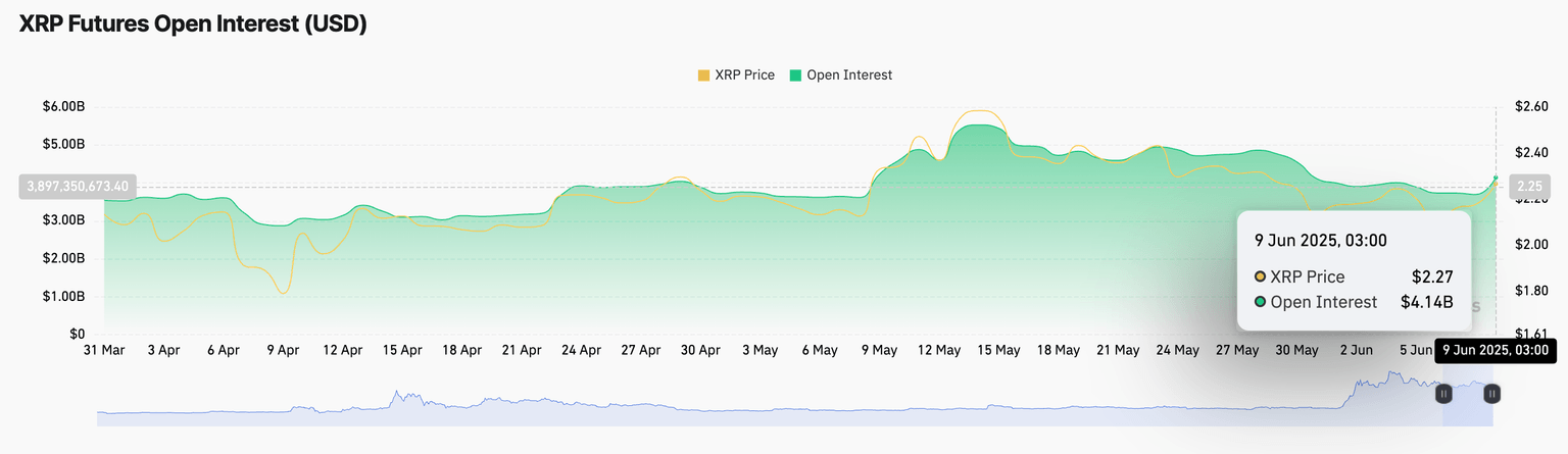 - Un aumento en el interés abierto de futuros de XRP a 4.100 millones de dólares indica un sentimiento y confianza en la performance del precio de XRP.