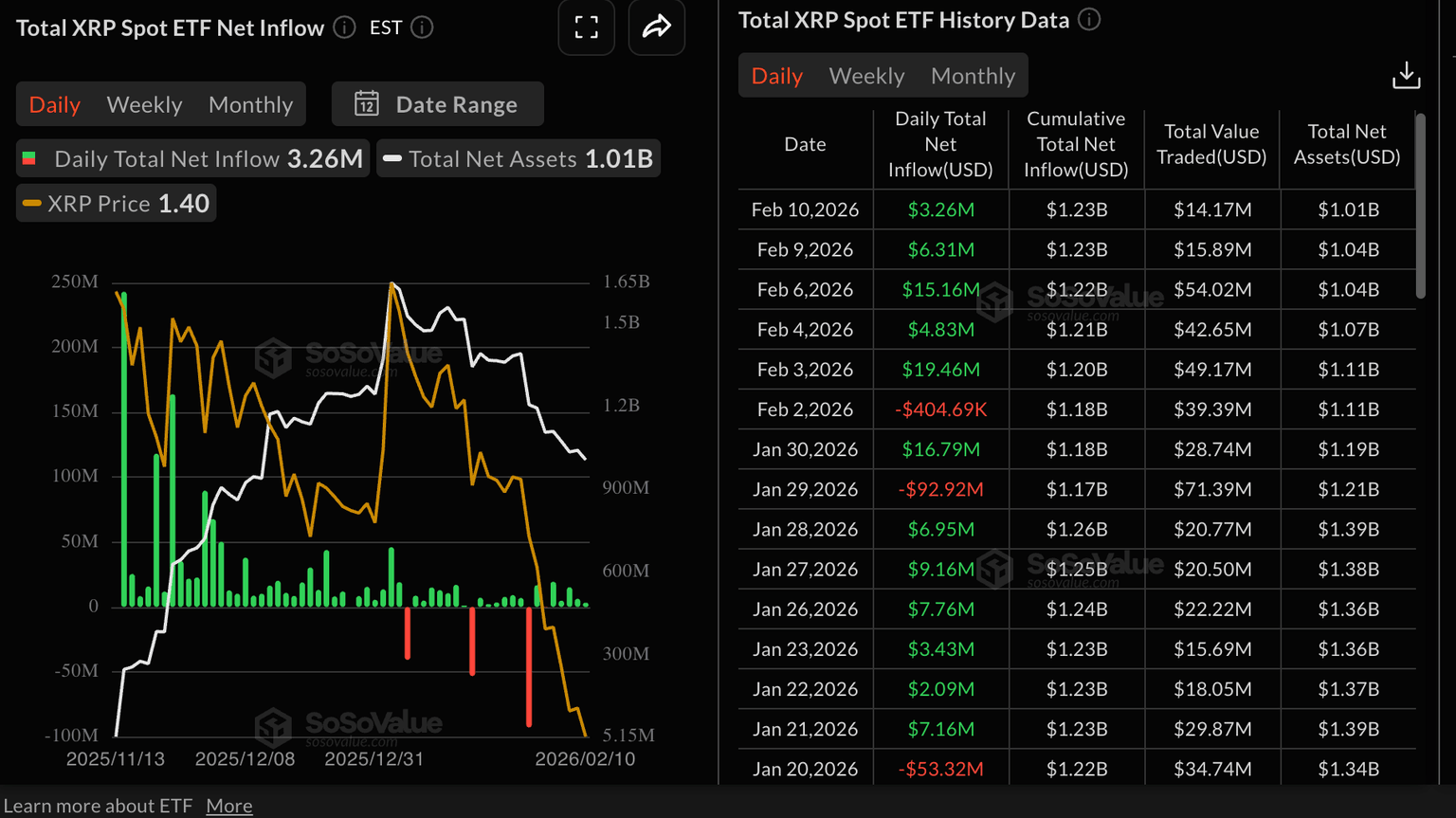 Mientras tanto, el interés institucional en XRP se mantiene estable, aunque con leves entradas en ETFs de XRP al contado. Durante cinco días consecutivos, los ETFs de XRP listados en EE.UU. han registrado entradas, con 3.26 millones de dólares depositados el martes.