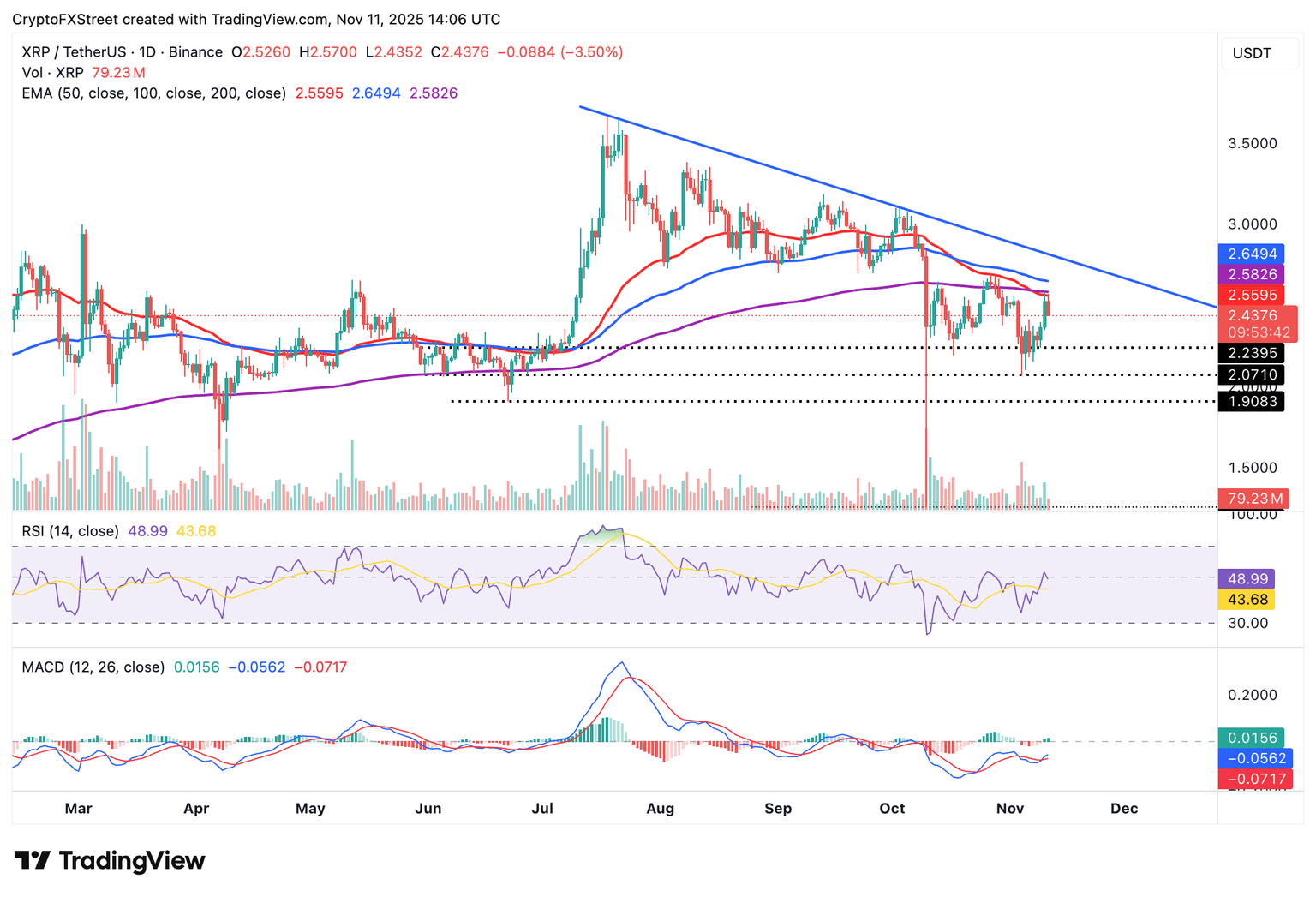 - XRP corrige después de probar la confluencia de las EMAs de 50 y 200 días en 2.58$.