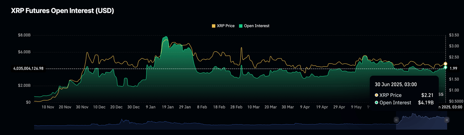 El Interés Abierto de futuros de XRP (OI) se mantiene estable por encima de la marca de 4 mil millones de dólares, reflejando un creciente interés en el token, particularmente después de haber recuperado de la caída a 3.54 mil millones de dólares el 23 de junio a 4.19 mil millones el lunes.