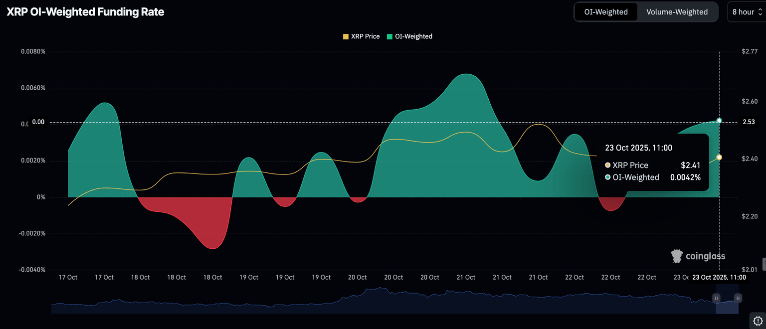 Mientras tanto, el interés minorista en XRP también se ha expandido en medio de las fluctuaciones de precios. Los datos de CoinGlass muestran que la tasa de financiación ponderada por el interés abierto (OI) de futuros se situó en 0.0042% el jueves, frente al -0.0007% del miércoles.