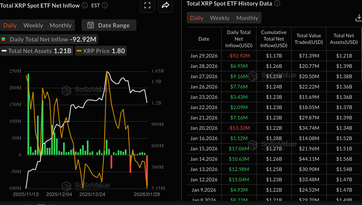 - Los ETF de XRP registraron la mayor salida en un solo día de casi 93 millones de dólares el jueves.