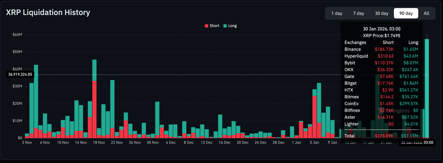 - Los traders de XRP con apalancamiento enfrentan la mayor liquidación en tres meses, totalizando 57 millones de dólares, a medida que el interés minorista disminuye.