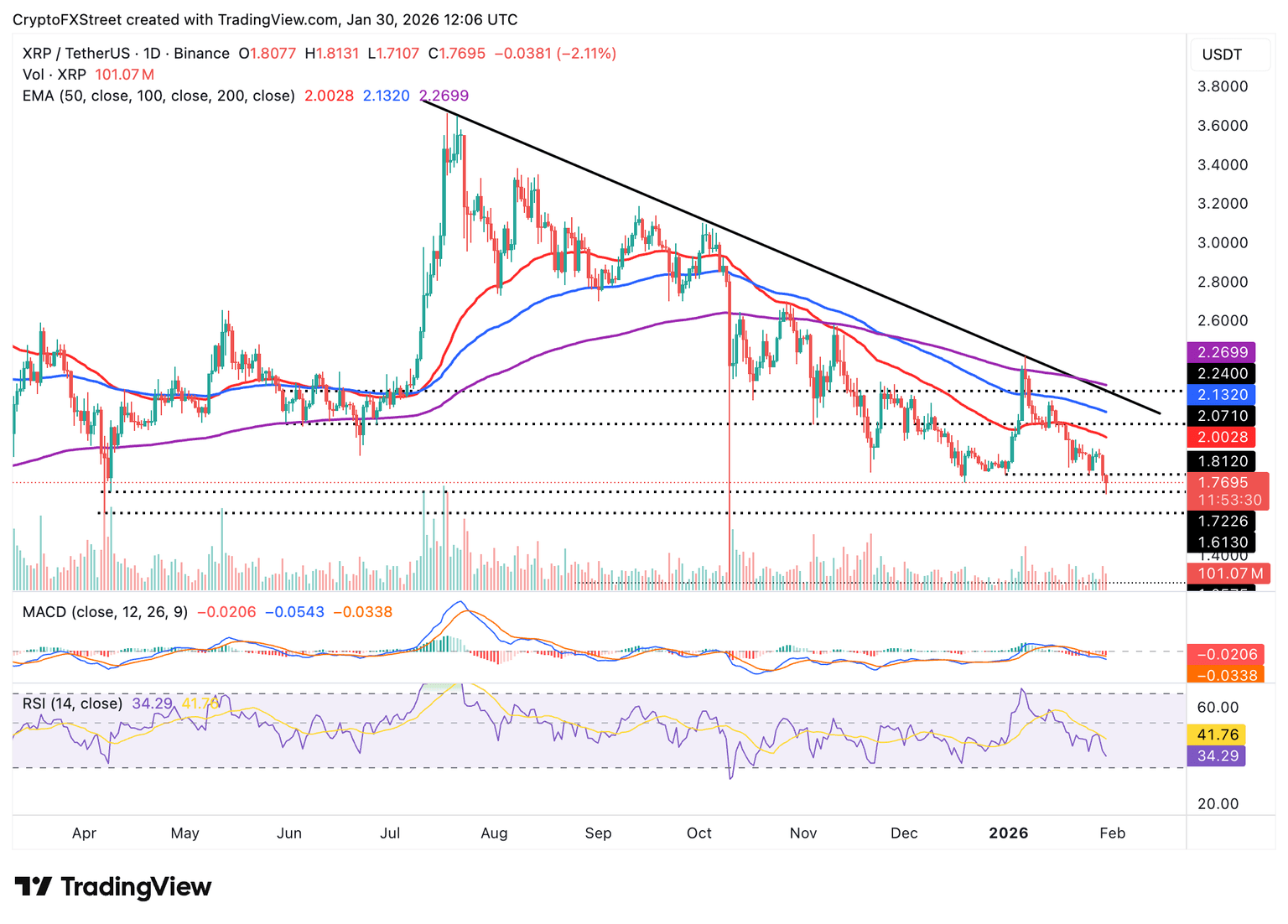 Los vendedores de XRP siguen controlando a menos que los alcistas intenten recuperar el soporte del 31 de diciembre en 1.81$ y el siguiente obstáculo clave, la EMA de 50 días en 2.00$.