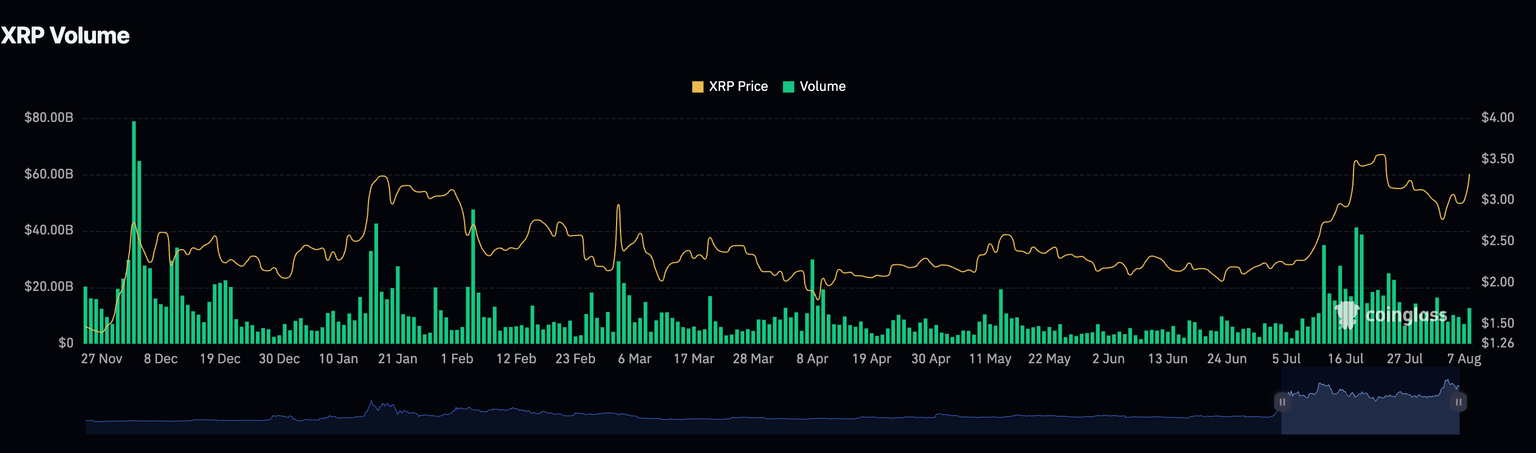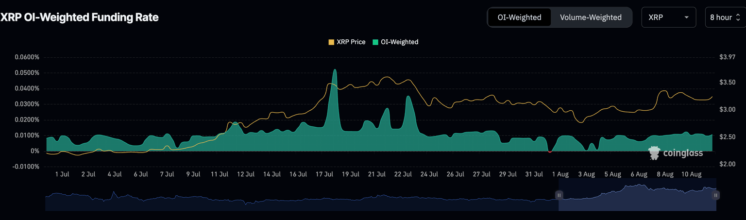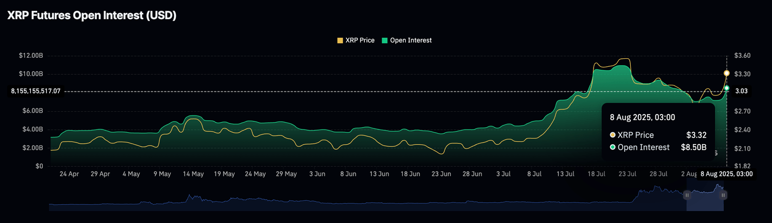 La recuperación del precio de XRP está ocurriendo en conjunto con el Interés Abierto (OI) de futuros. Los datos de CoinGlass muestran que el OI, que se refiere al valor nocional de los contratos de futuros u opciones pendientes, avanzó y promedió 8.5 mil millones$ el lunes. Esto representa un aumento del 17% desde los 7.05 mil millones$ registrados el 3 de agosto.