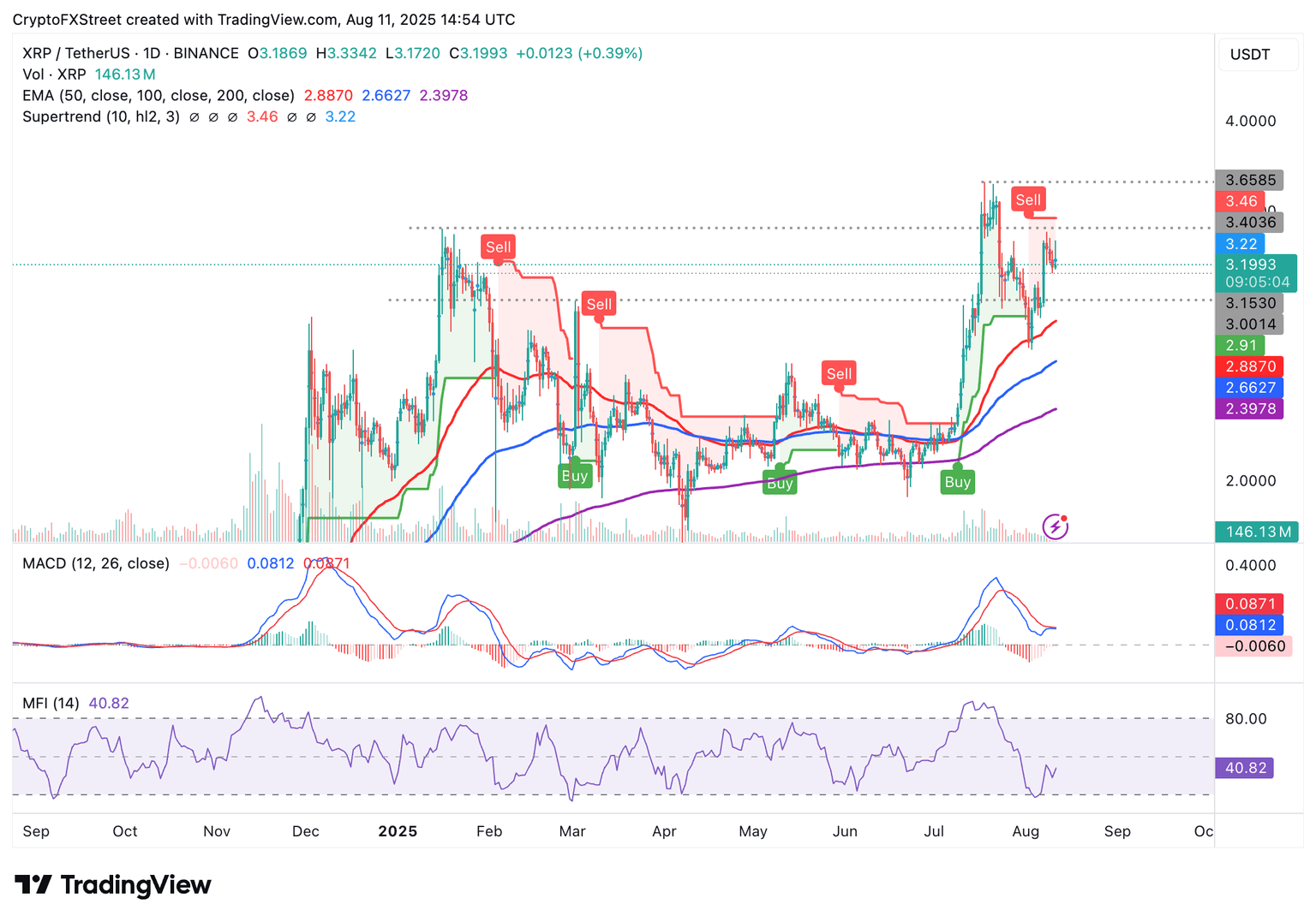 El precio de XRP se mantiene entre el soporte en 3.00$ y la resistencia en 3.40$. El Índice de Flujo de Dinero (MFI), que se ha recuperado ligeramente por encima de 40, indica que más dinero está fluyendo hacia XRP.