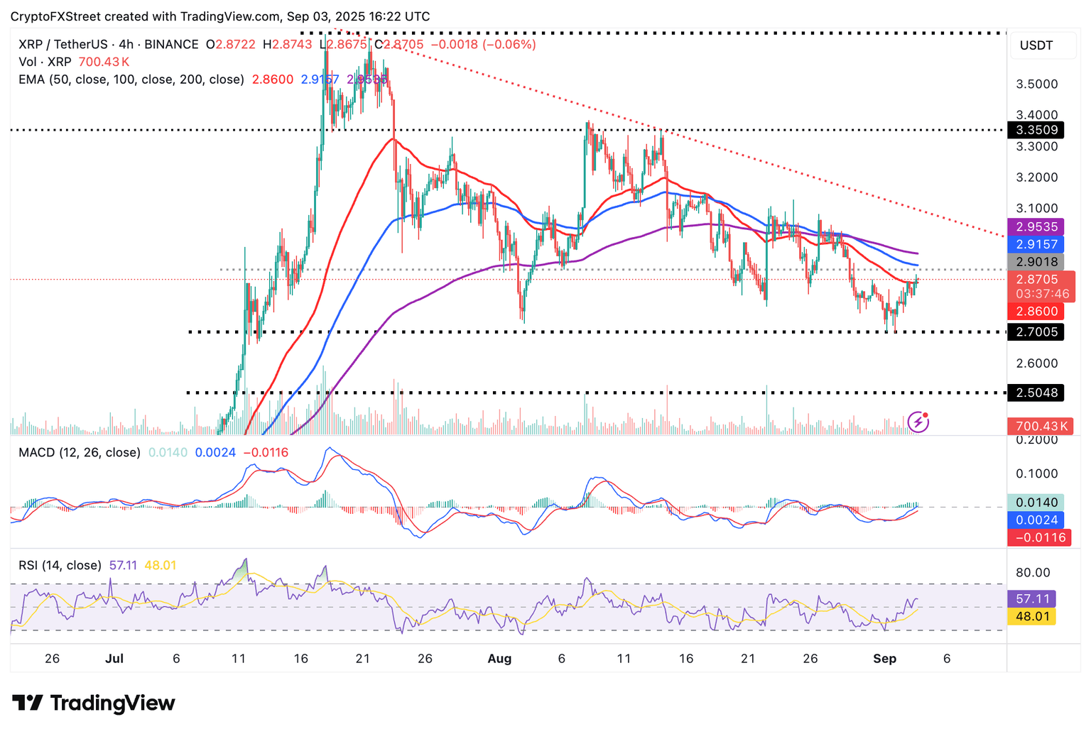 El precio de XRP mantiene una perspectiva alcista, posicionado por encima de la Media Móvil Exponencial (EMA) de 50 períodos en 2.86$. Una señal de compra del indicador de Convergencia/Divergencia de la Media Móvil (MACD) refuerza el control alcista, después de mantener una señal de compra desde el lunes.