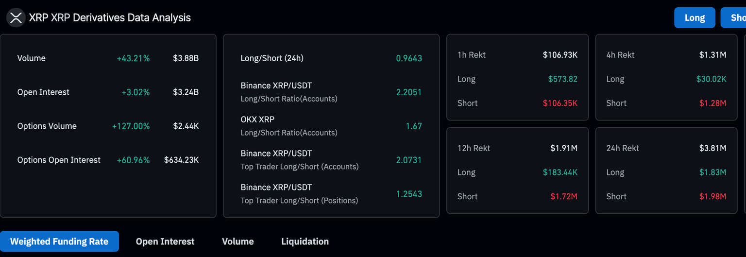 Los datos de Coinglass sobre los derivados de XRP sugieren que el sentimiento está mejorando, lo que podría elevar el activo digital a niveles más altos en los próximos días. Un aumento del 3% en el interés abierto a 3.240 millones de dólares sugiere que nuevo capital está ingresando al mercado de derivados debido al creciente interés o confianza de los traders en la dirección del precio de XRP.