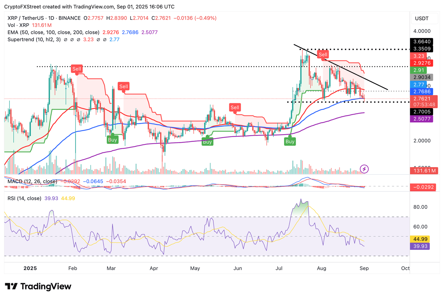 El precio de XRP está luchando por mantener la media móvil exponencial (EMA) de 100 días en 2.76$ mientras el sentimiento bajista se propaga en el mercado de criptomonedas más amplio. El camino de menor resistencia es hacia abajo según la imagen técnica prevaleciente.