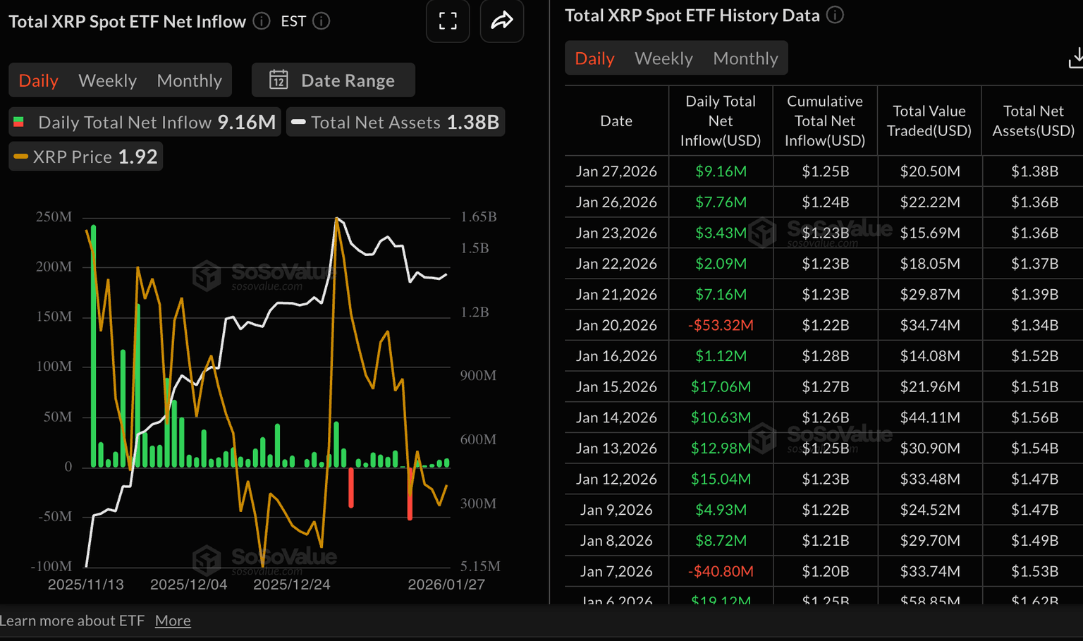 El interés en los fondos cotizados (ETF) de XRP al contado se ha mantenido en gran medida estable desde su lanzamiento, a pesar de la volatilidad de precios. Los ETF, autorizados para operar en los Estados Unidos (EE.UU.), registraron aproximadamente 9 millones de dólares en entradas el martes, llevando las entradas netas acumuladas a 1.25 mil millones de dólares, con los activos totales bajo gestión (AUM) rondando los 1.38 mil millones de dólares.