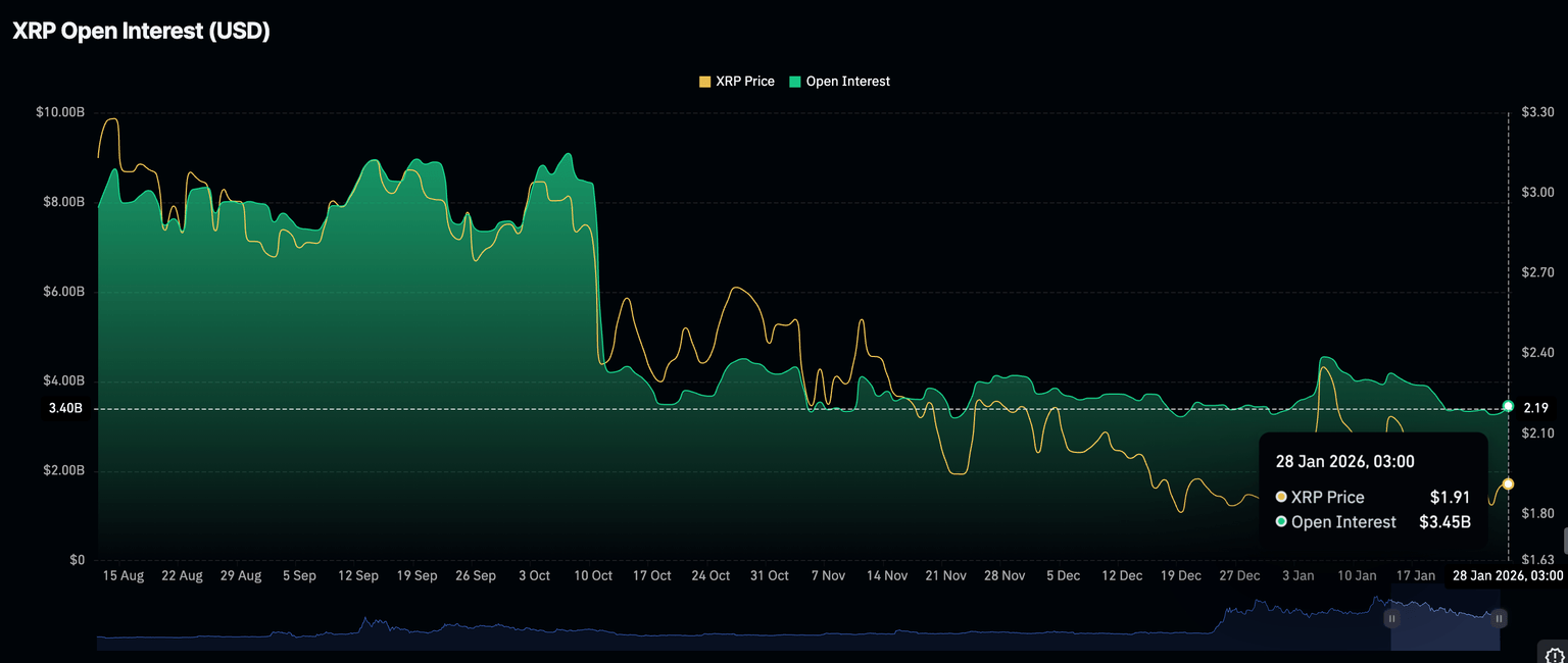 - El mercado de derivados de XRP muestra fuerza relativa, con el Interés Abierto de futuros aumentando a 3.45 mil millones de dólares