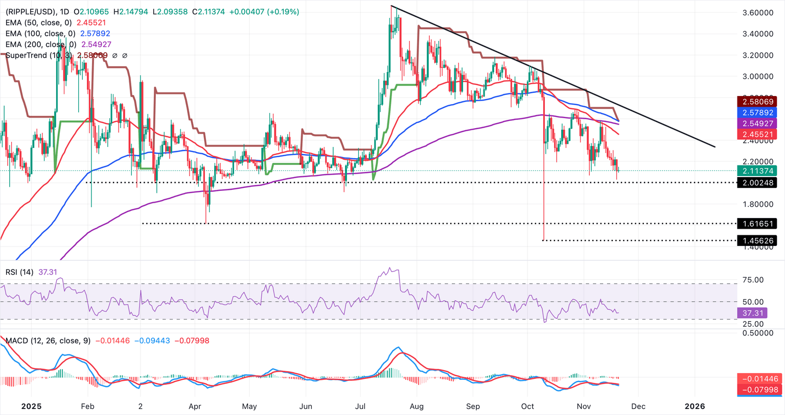Por encima, el indicador SuperTrend desciende cerca de 2.58$, alineándose con las EMAs de 200 y 100 días para formar una fuerte banda de resistencia en 2.54$-2.57$. Las medias móviles continúan girando, por lo que cualquier rebote enfrentaría la primera resistencia en la EMA de 50 días en 2.45$, y un cierre diario por encima de esa barrera podría aliviar la presión a la baja.