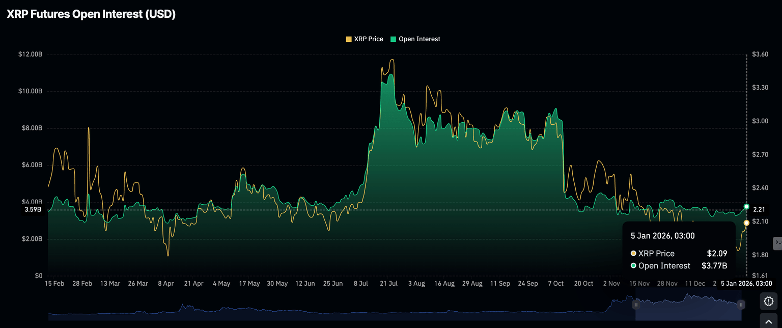 XRP está subiendo por quinto día consecutivo, apoyado por entradas constantes en fondos cotizados en bolsa (ETFs) al contado. El interés minorista en el token de remesas transfronterizas muestra signos de un regreso gradual, como lo evidencia el aumento del interés abierto (OI) de futuros a 3.800 millones de dólares.