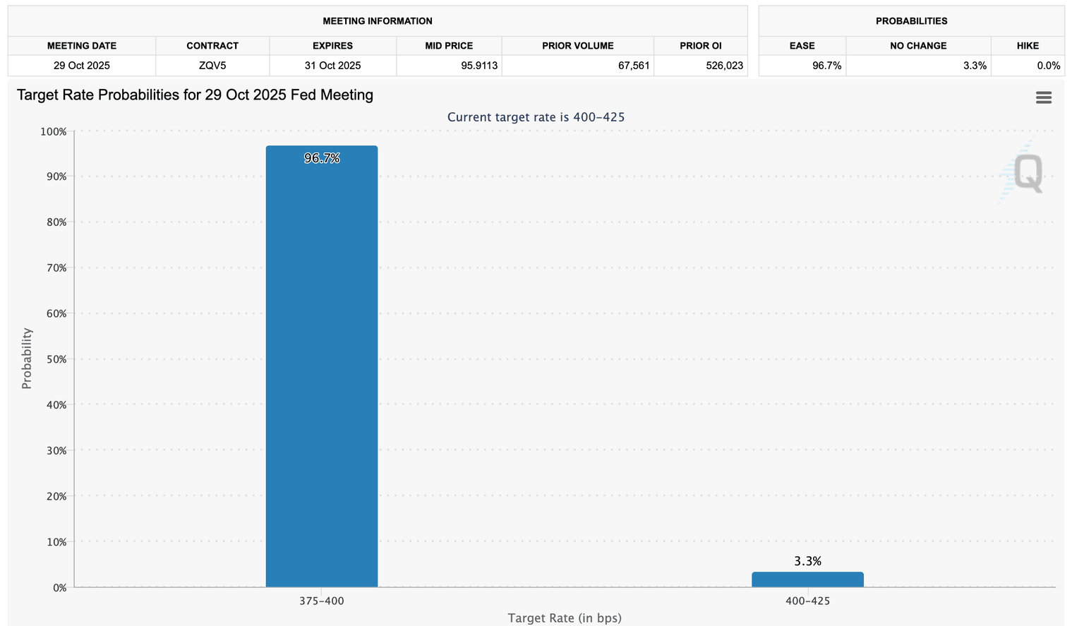 Sin embargo, XRP podría extender su recuperación por encima del obstáculo inmediato de 2,70$ si el sentimiento continúa mejorando esta semana, respaldado por la decisión de la Reserva Federal de EE.UU. (Fed) sobre las tasas de interés. Los expertos encuestados por el CME Group creen que hay un 96,7% de probabilidad de que la Fed recorte las tasas en 25 puntos básicos, llevando el tipo de referencia a un rango de 3,75% a 4,00%.