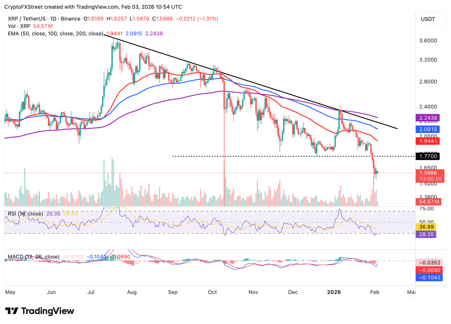 XRP exhibe un sesgo bajista, cotizando por debajo de 1.60$, socavado por una estructura técnica debilitada. La posición del token de remesas por debajo de la Media Móvil Exponencial (EMA) de 50 días en 1.94$, la EMA de 100 días en 2.09$ y la EMA de 200 días en 2.24$, refuerza la tesis bajista.