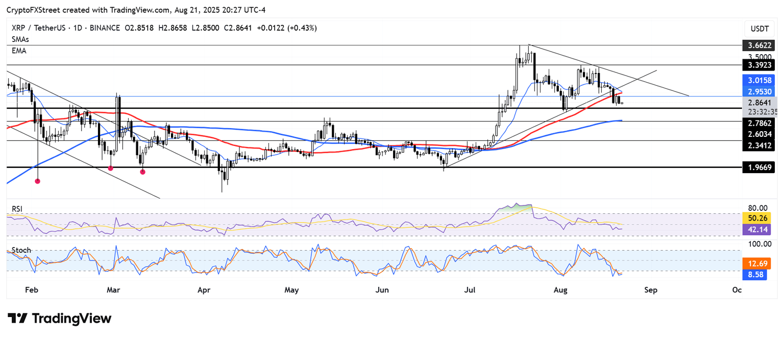 XRP cayó un 3% a 2.85$ el jueves mientras los inversores registraban más de 300 millones de dólares en beneficios tras las minutas de línea dura del Comité Federal de Mercado Abierto (FOMC) de su reunión de julio.