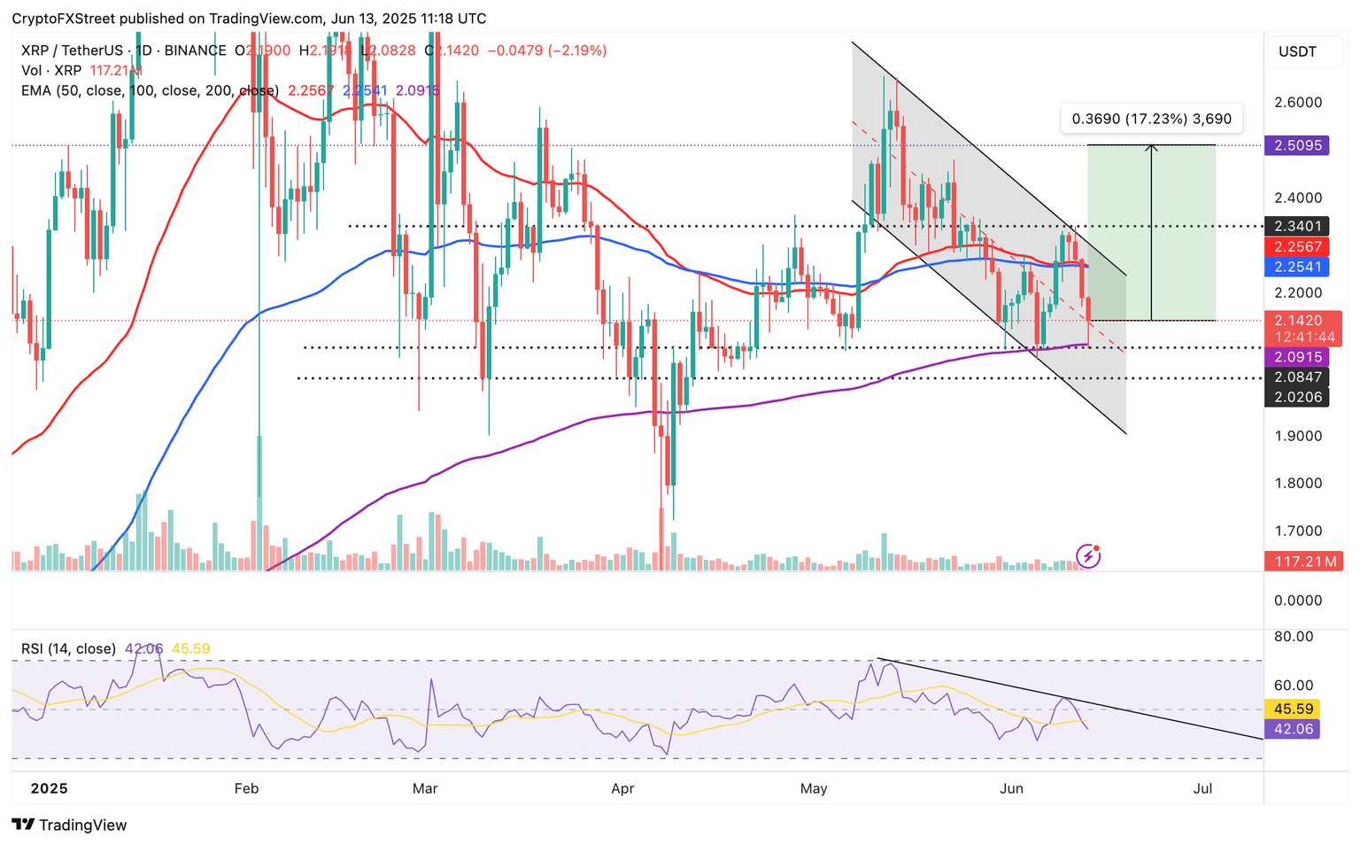 El precio de XRP se mantiene en torno a 2.14$ en el momento de escribir este artículo después de una ligera recuperación desde el soporte en torno a 2.09$, reforzado por la Media Móvil Exponencial (EMA) de 200 días.