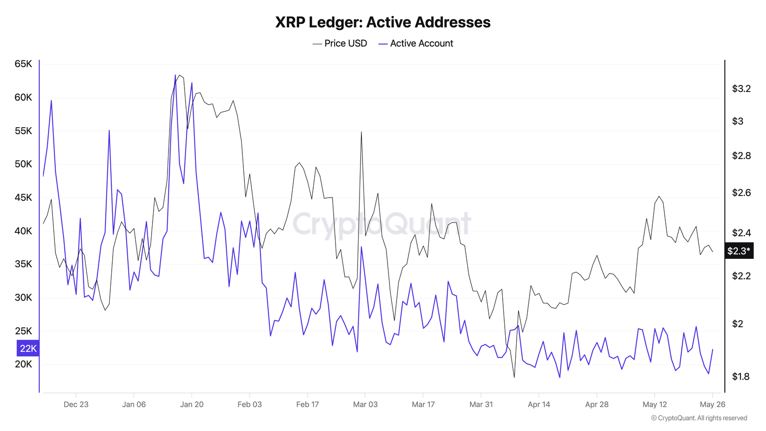 La consolidación prolongada en el precio de XRP apunta a cambios en los fundamentos clave, incluida la interacción de los usuarios con el protocolo blockchain. La métrica de Direcciones Activas de CryptoQuant, como se muestra en el gráfico a continuación, indica una disminución significativa del 44% de 39,515 a 22,253 direcciones.