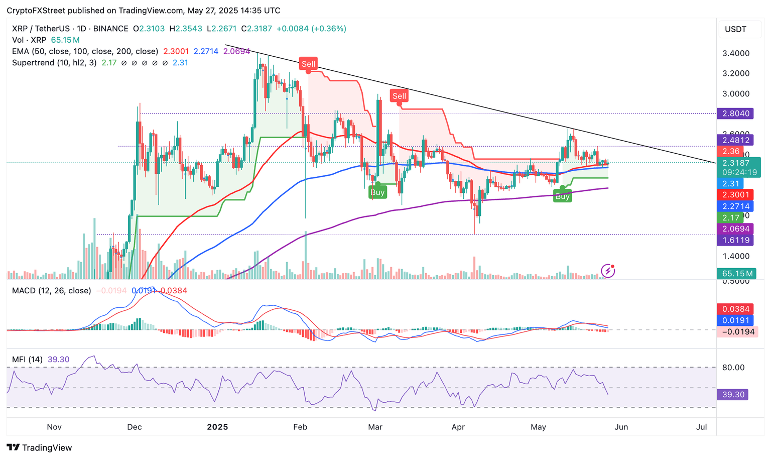 Al mismo tiempo, el Índice de Flujo de Dinero (MFI), un indicador de momentum que mide el flujo de dinero dentro y fuera de XRP, está en descenso. La caída desde condiciones cercanas a sobrecompra en 76 el 14 de mayo respalda la perspectiva bajista.