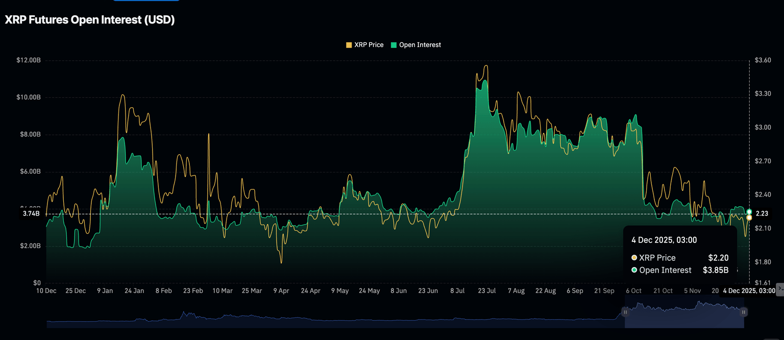 El mercado de derivados de XRP también vio un ligero aumento en la demanda minorista, con el Interés Abierto (OI) de futuros promediando 3.85 mil millones de dólares el jueves, en comparación con 3.75 mil millones de dólares el día anterior. El OI, que mide el valor nocional de los contratos de futuros pendientes, había disminuido a 3.19 mil millones de dólares el 22 de noviembre, el nivel más bajo desde el 22 de abril.