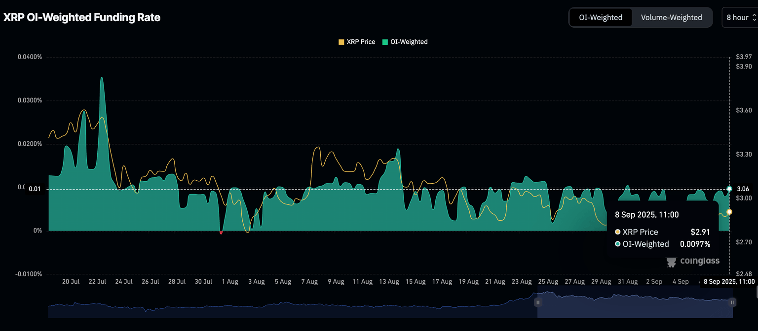 El aumento constante en la tasa de financiación de futuros a 0.0083% en el momento de escribir este artículo, desde 0.0047% el 2 de septiembre, respalda la perspectiva alcista para los derivados de XRP. Un aumento constante en esta métrica sugiere que más traders están apalancando posiciones largas en XRP, lo que refuerza el sentimiento alcista del mercado.