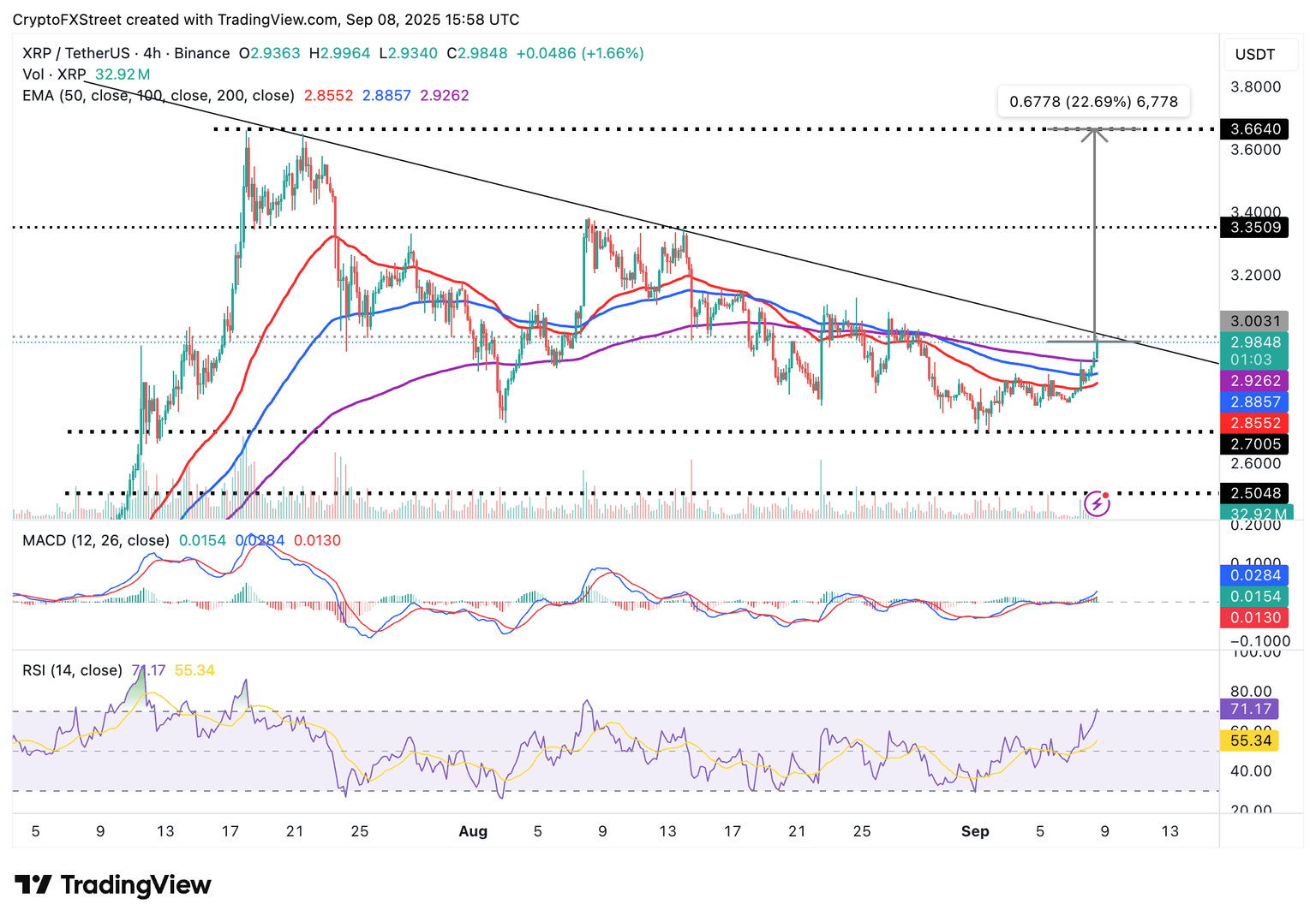 XRP se mantiene por encima de las medias móviles clave en el gráfico de 4 horas, incluyendo la EMA de 200 periodos en 2.92$, la EMA de 100 periodos en 2.88$ y la EMA de 50 periodos en 2.85$, señalando un sentimiento positivo en el mercado.