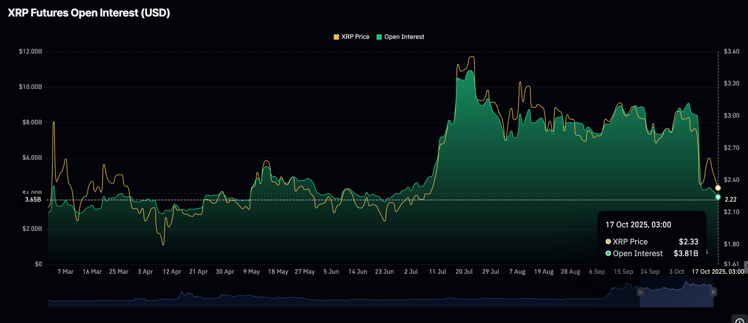 Según los datos de CoinGlass, la demanda minorista de XRP sigue suprimida, como lo demuestra una caída masiva en el interés abierto de futuros (OI), que promedia 3.81 millones de dólares el viernes.